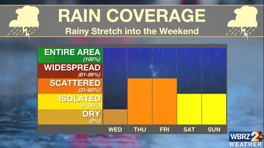 Up Next: On Thursday, scattered showers will start up just before noon for areas north of Baton Rouge. Most of the showers on Thursday will stay north of Baton Rouge, but as the sun goes down, the rain will push south. Overnight showers will be on and off as they keep moving toward the coast. The shower activity will be light, on and off, and will continue through the day Friday. Rain will be possible on Saturday and Sunday as well, but it will be much less widespread. The total rain accumulation through the weekend is expected to be less than one inch for the Baton Rouge area and about 1 inch for areas further north. Temperatures will be near 70 Thursday through Sunday. Click here to see the 7-day forecast.