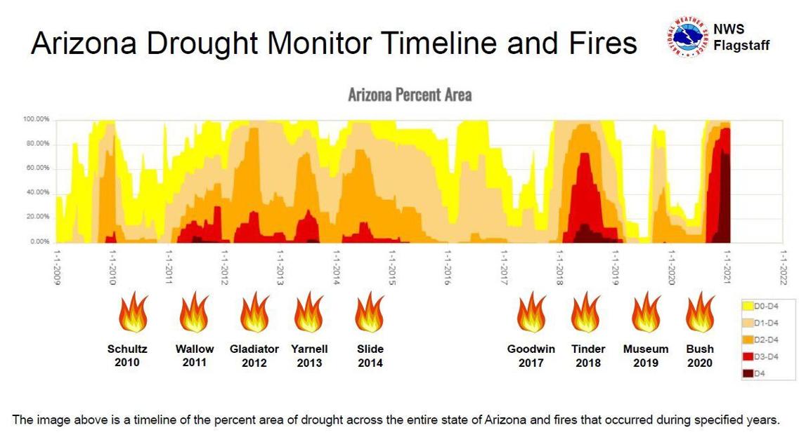 We’re currently in record territory, as measured by how much of the state remains in drought at this point in the winter. Conditions right now dwarf the worst fire seasons on record, including the years that spawned the Wallow, the Schultz, the Yarnell Hill and the Rodeo-Chediski. The closest comparisons would be the Tinder Fire in 2018 and the Bush Fire last year. Last year coming off a much wetter winter, Arizona essentially tied the all-time record for acres burned — nearly 1 million.